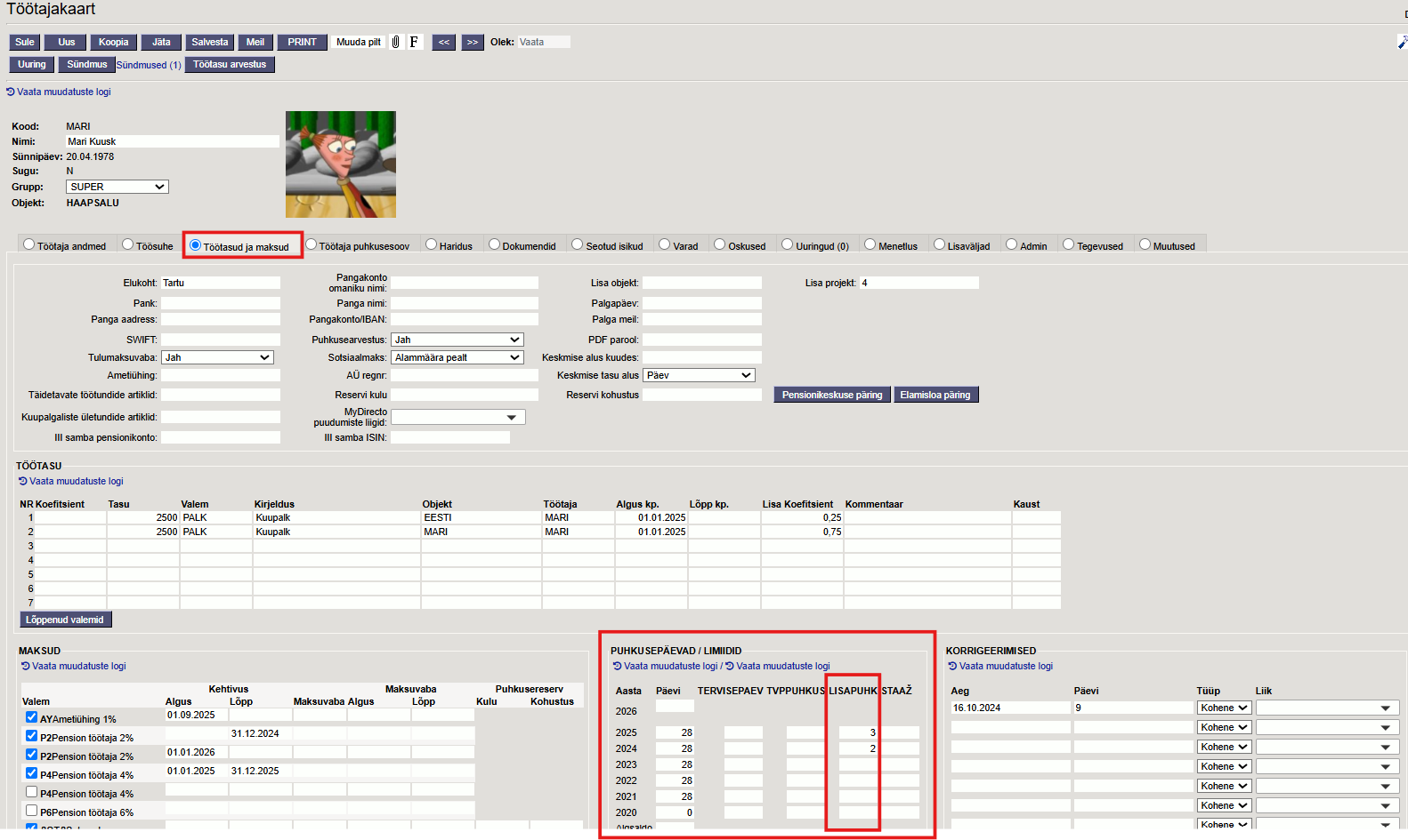 Puudumise liigi limiit väljale sisestatud koguse puhul on õigus sellele puudumise liigile kõikidel töötajatele. Juhul kui soovitakse Lisapuhkust anda ainult teatud töötajatele, lisatakse päevade arv töötajakaardile Töötasud ja maksud sakil, Puhkusepäevad/limiidid osas.