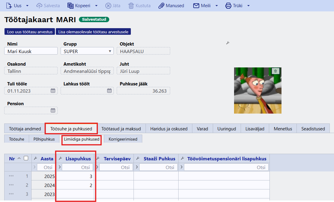 Uue kujundusega töötajakaardil sakk Töösuhe ja puhkused, Limiidiga puhkused alamsakk.