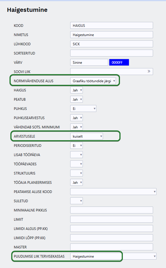Normivähenduse alus - kui töögraafikuid ei kasutata, on normivähenduse alus puudumiste puhul tavaliselt koormuse järgi. Kui töögraafikud on kasutuses ning soovitakse haiguste puhul normtunde vähendada vastavalt töölks planeeritud ajale, valida normivähenduse aluseks „graafiku töötundide järgi“. Puudumise liik, mille puhul ei pea üldse normtunde vähendama, valida „Ei vähenda“.