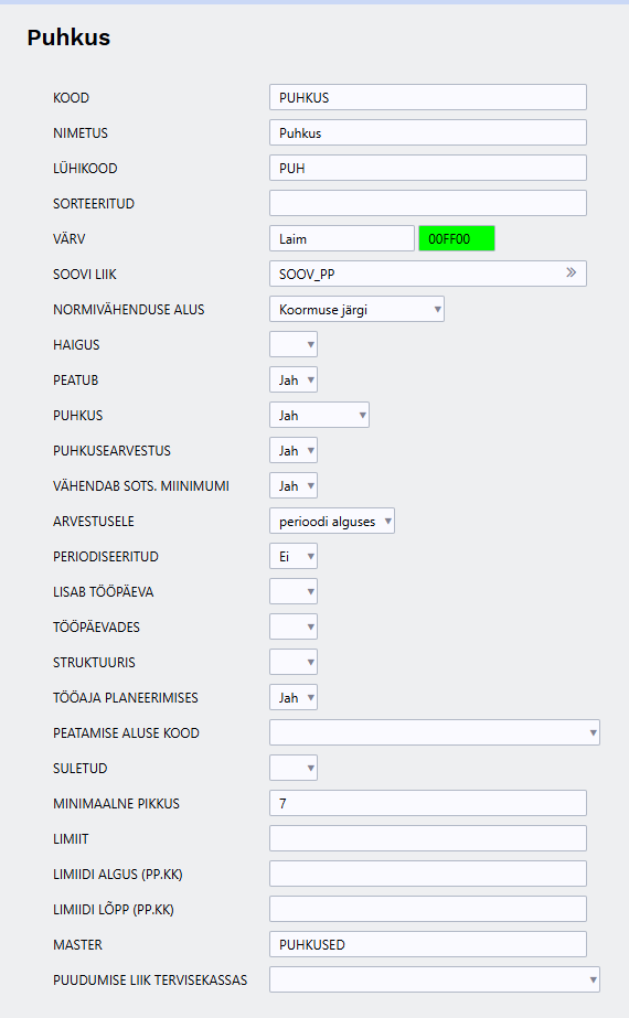 Puhkus - JAH valik teha ainult sellise puudumise liigi korral, mis vähendab puhkusejääki (reeglina vaid põhipuhkus). EI kasutada sellise liigi puhul, millega kompenseeritakse ületunde (vaba päev ilma, et töötaja puhkusejääk muutuks). Lisab juurde - Eestis ei kasutata, loodud välisriikide jaoks.
