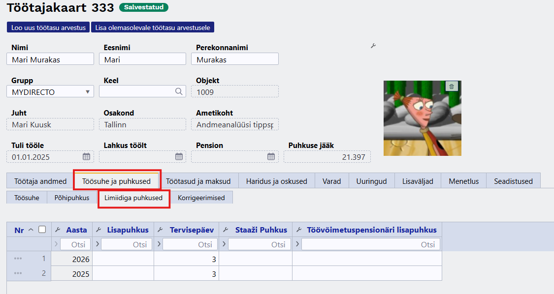 Puudumise liigi limiit väljale sisestatud koguse puhul on õigus sellele puudumise liigile kõikidel töötajatele. Juhul kui soovitakse Lisapuhkust anda ainult teatud töötajatele, lisatakse päevade arv töötajakaardile Töösuhe ja puhkused sakil, Limiidiga puhkused osas.