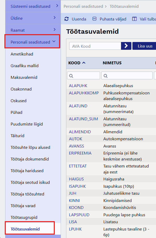 Töötasuvalemite registris hoitakse töötasuvalemeid töötasude ja puudumiste arvestamiseks.