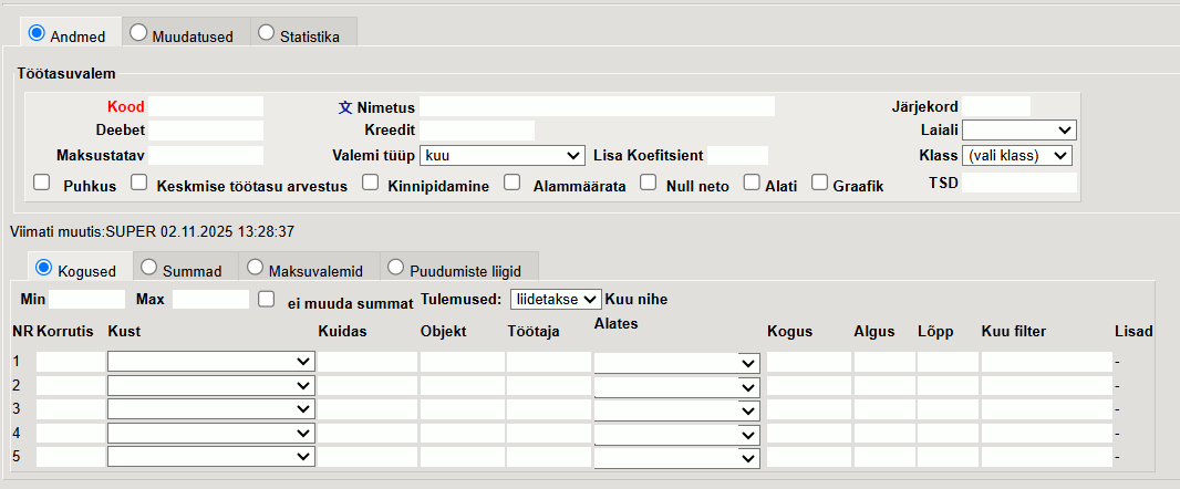 Töötasuvalemit on võimalik lisaks eelnevale seadistada alus infot võtma Directo erinevatest andmekogudest. Selleks on töötasuvalemil sakid Kogused, Summad, Maksuvalemid, Puudumiste liigid