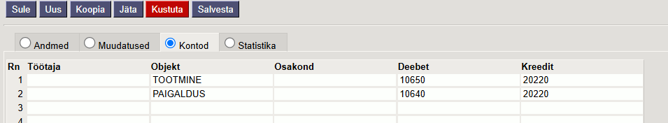 Selle saki alla saab lisada kontod. See kust võetaks objekt kandele on määratud seadistusega : Töötasu- ja maksuvalemi konto objektifilter. Personali seadistused