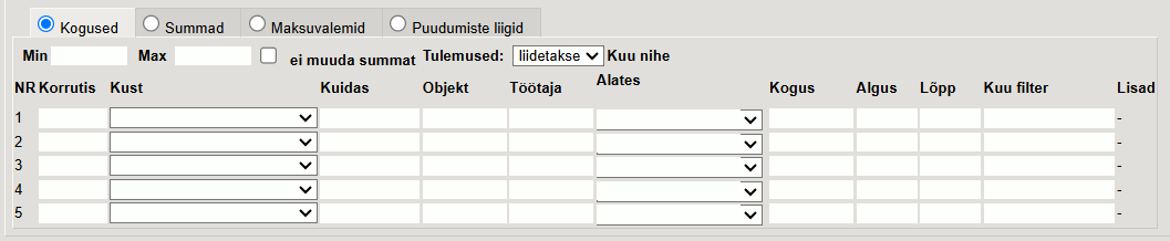 Piirang- määratakse ajaline piirang „Min“ ja „Max“ summade osas: aasta, kuu, päev.