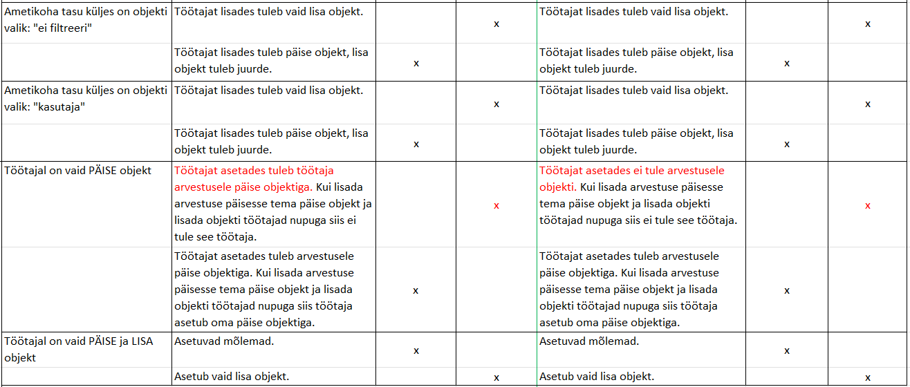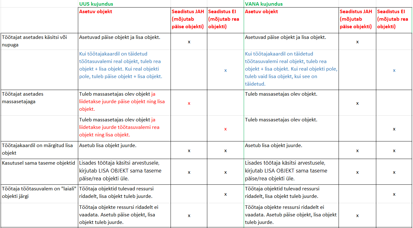 Järgnevas tabelis on välja toodud erinevused objekti asetumise osas sõltuvalt süsteemi seadistusest: Töötasu arvestusele alati kasutaja objekt sõltumata valemist.