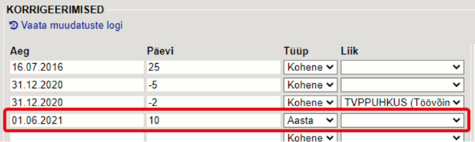 Võimalik on sisestada või vähendada erinevat liiki puudumistele lisapäevi.