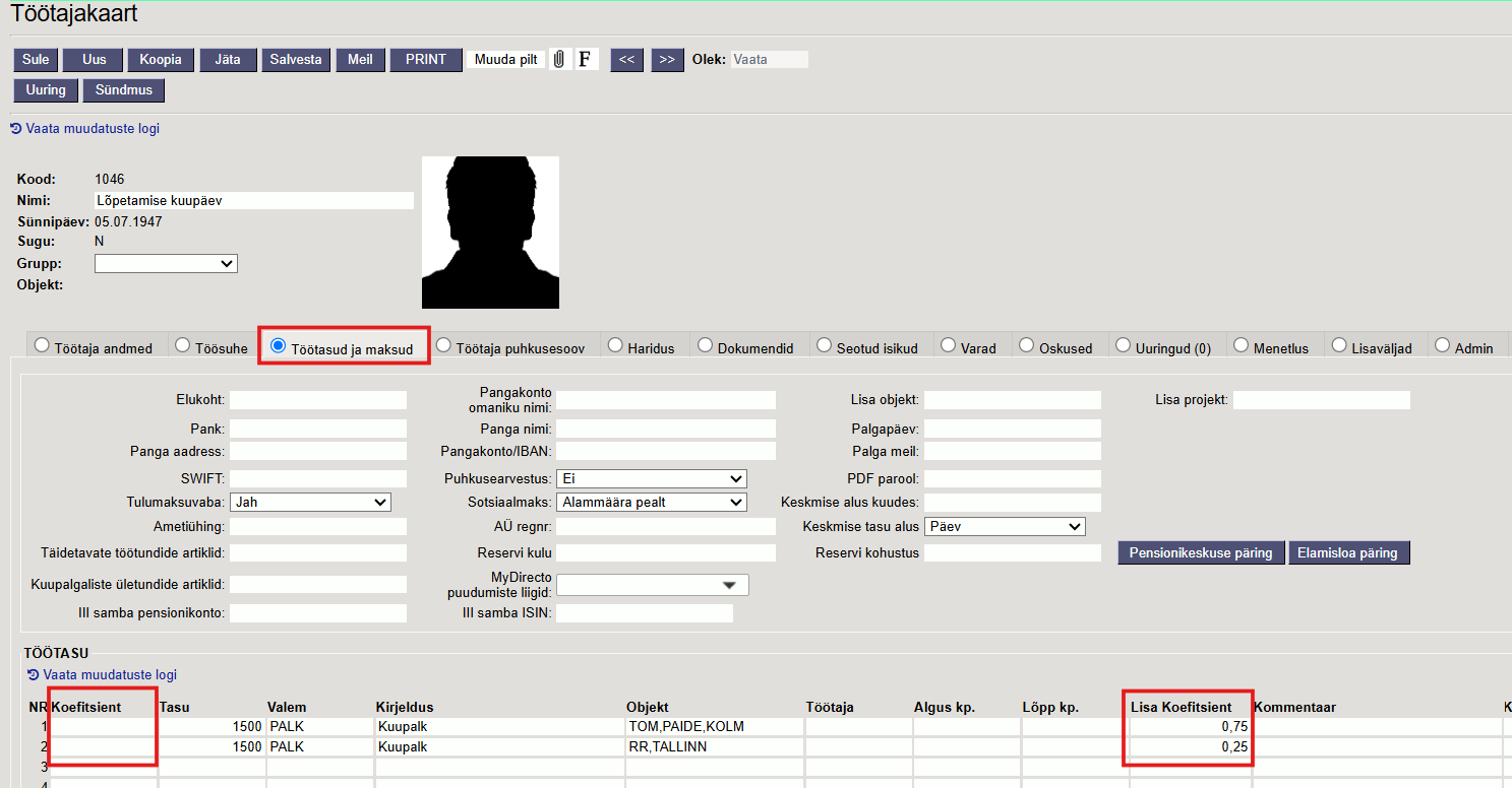- Koefitsiendi alusel objektiks jagamise töötasuvalemid- töötasuvalem, millele on töötajakaardil koefitsient ja objekt määratud.