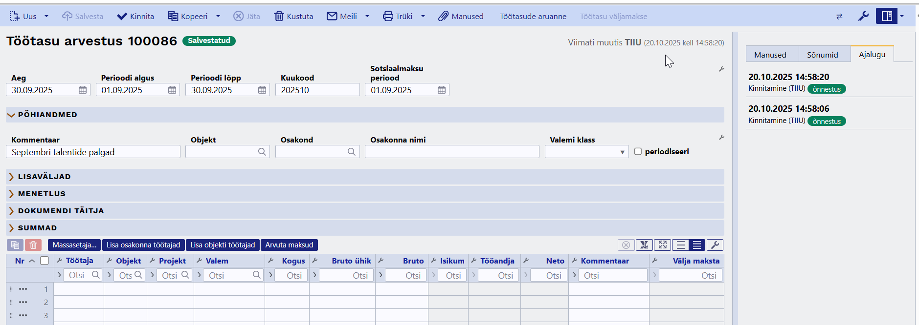 Aeg - dokumendi kande kuupäev. Selle kuupäevaga tehakse töötasu arvestuse kanne.