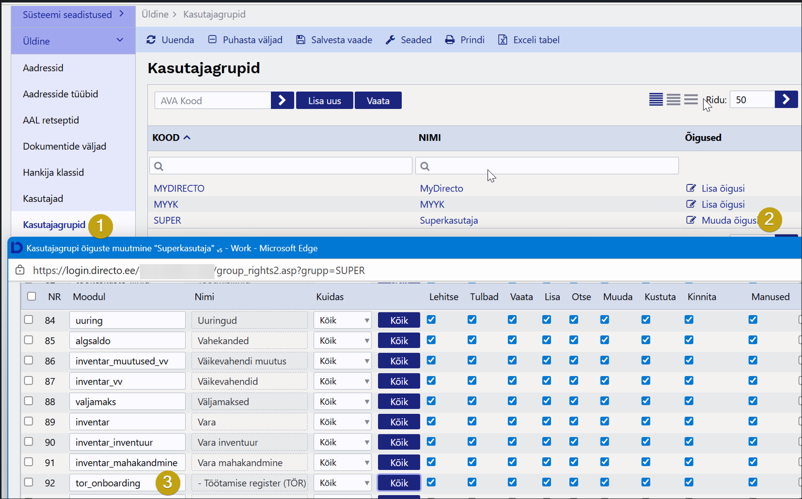 Kasutajagrupi õiguste all tuleb lisada SUPER kasutajagrupile Töötamise Registri mooduli õigused, minimaalselt linnuga „Lehitse“ ning vastav õigus salvestada.