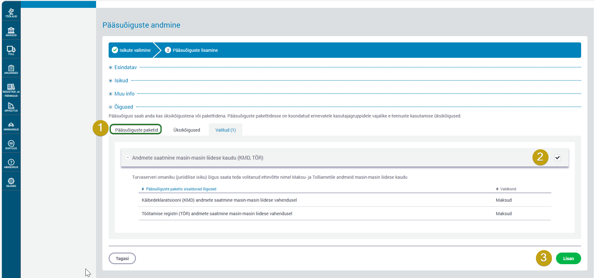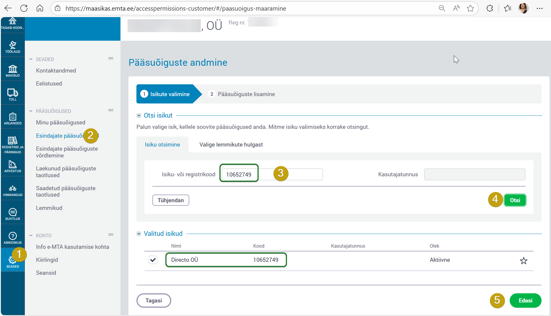 Töötamise Registri funktsionaalsus nõuab uue töötajakaardi kasutuselevõttu. Töötamise registri andmete vahetamiseks ning vastava mooduli kasutusele võtuks on vaja ettevõttel anda Directole (reg.nr 10652749) esmalt masin-masin liidese õigused. Seda tehakse EMTA veebilehelt ärikliendi vaatest, nupu alt Seaded. Liigu edasi pildil näidatud sammude järgi.
