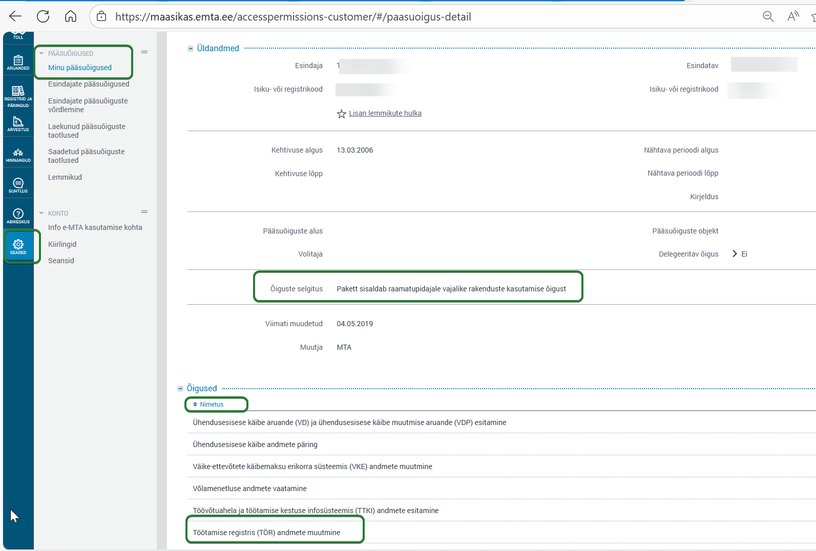 Ka Töötajale, kes sisestab töötajate andmeid ning soovib otse Directost nende kohta toiminguid TÖR'i saata, peab olema antud õigus TÖRis andmete muutmiseks. Töötaja saab seda kontrollida, liikudes EMTA veebilehel ärikliendi vaates Seaded > Minu pääsuõigused. Veenduda tuleks, et pääsuõigus või volitus sisaldaks õigust TÖRi andmete muutmiseks.