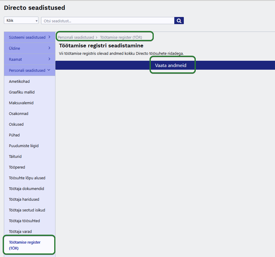 Peale salvestamist liigu Personali seadistuste juurde, kuhu on tekkinud uus alaseadistus Töötamise register (TÖR). Kui uus alaseadistust ilmunud ei ole, on abiks lehe värskendamine F5ga. Sealt saab juba TÖRis olevaid andmeid vaadata ning omavahel siduda.