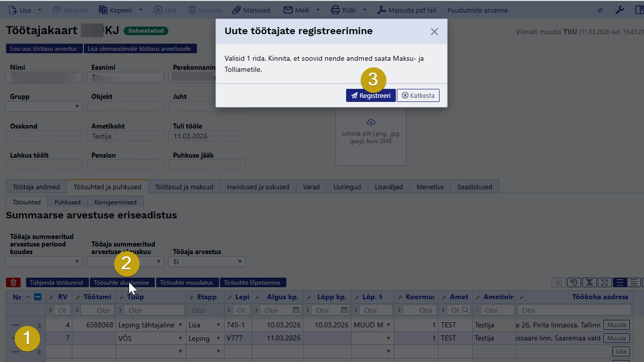 Edasine töövoog andmete muutmisel või uue töösuhte TÖRi saatmisel käib juba konkreetse töötaja kaardilt.
