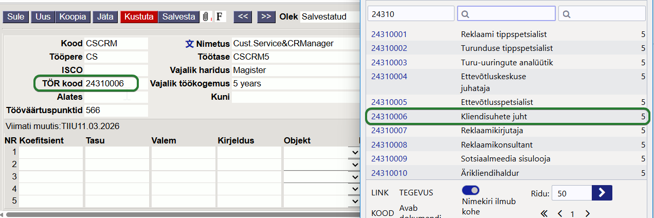 Ametikohal, mis töötajale lisatud, peab olema TÖR kood lahtris 8-kohaline TÖR kood - selle alusel tekib TÖRi ametikoha nimetuse kirje.