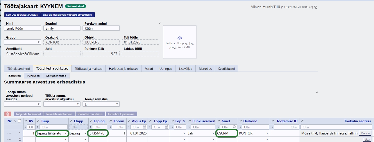 Oluline on märkida, et ka Personali seadistustes on kaks detaili, mis peavad korrektseks andmevahetuseks lisatud olema. Töötaja töösuhete juurde peab olema valitud ka Töötamise liik - selle liigi kohaselt tehakse Töötamise registrisse ka vastav kanne.