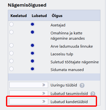 • Väljale saab sisestada komadega eraldatud kandetüüpide loendi (nt FIN, ARVE, LAEK jne.), mida kasutaja näha tohib.