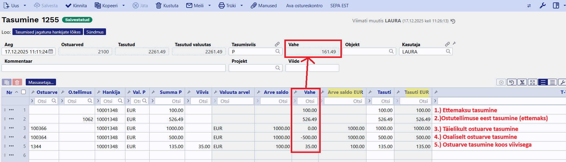 - Vahe - Tasuti ja arve saldo vahe baasvaluutas.