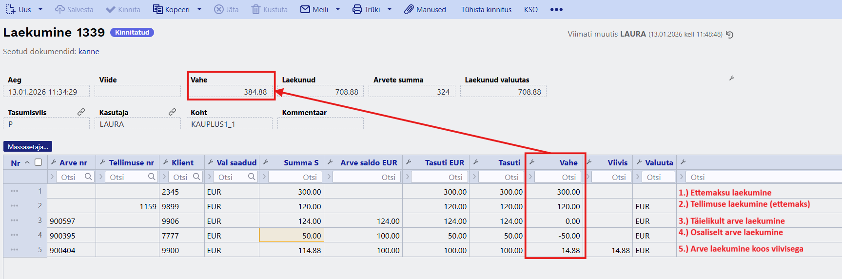 - Vahe - Laekunud ja arve saldo vahe baasvaluutas.