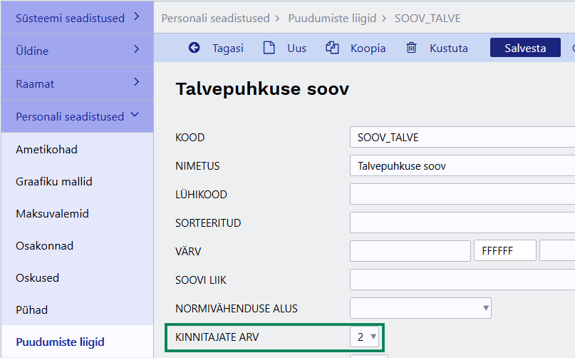 1. Juurde tuleb teha uus puudumise liik, iga olemasoleva puudumise liigi jaoks, mille kohta on võimalik töötajal sisestada puudumise soovi.