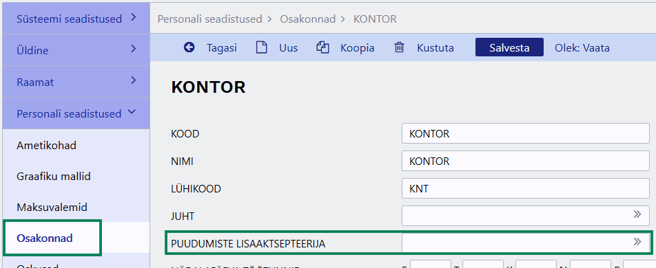 Kui on valitud Juht + osakonna juures määratu, saab osakonna kaardil Puudumiste lisaaktsepteerija väljal valida kasutajate registrist lisaaktsepteerijad komalistina.