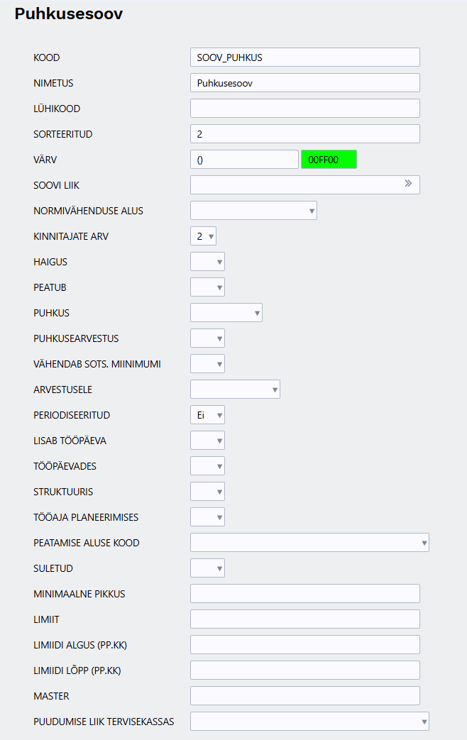 Järgmisena tuleb loodud puudumise liik ära siduda nn päris puudumise liigiga. Selleks avada olemasolev puudumise liik ja lisada väljale Soovi liik eelnevalt loodud puudumise liik.