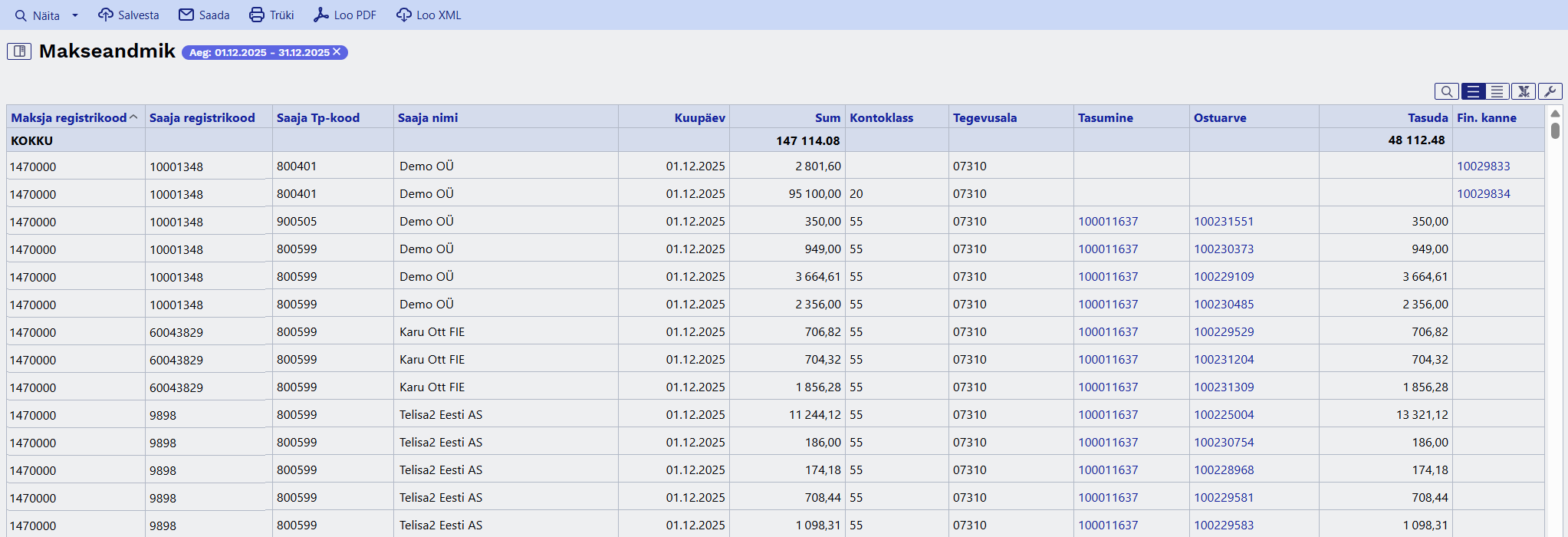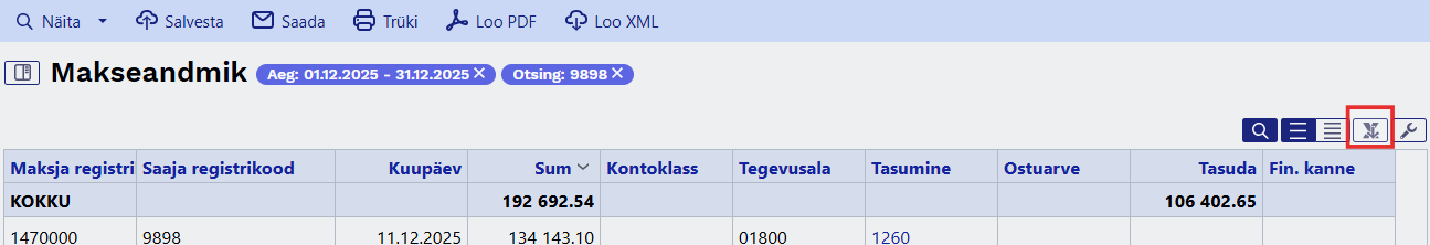 Makseandmiku saab esitamiseks XML-kujul allalaadida päise nupu Loo XML kaudu.