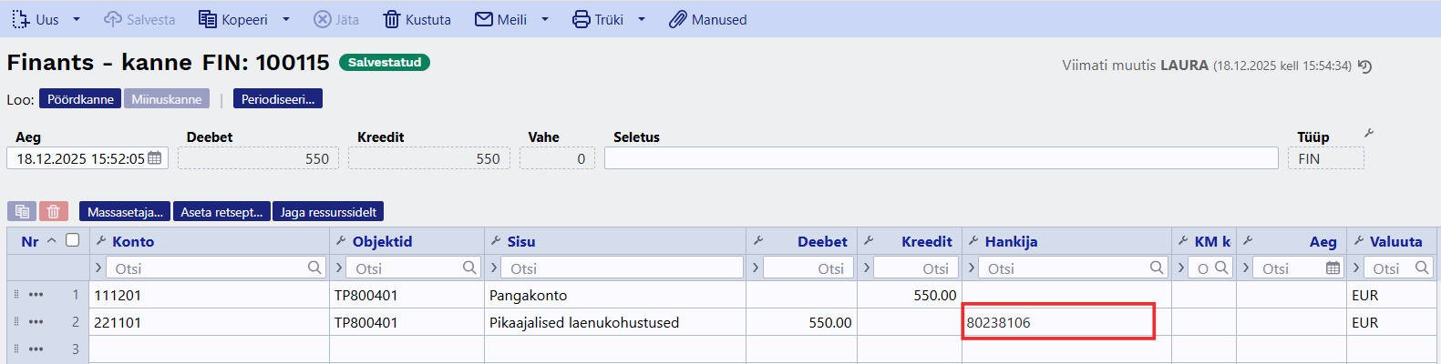 Makseandmiku jõuavad finantskanded (FIN tüüpi kanded), millel on rea küljes hankija. Ehk kui näiteks tehakse laenu tagasimakset finantskandena, siis peaks kanne välja nägema nii: