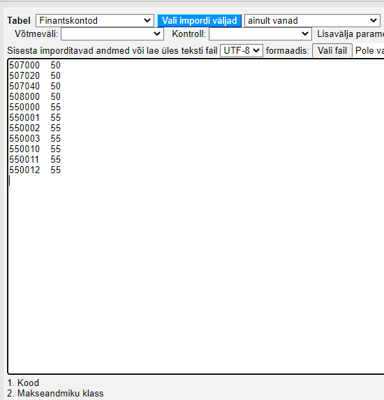 Makseandmiku klassi saab kontodele ka massimpordi mooduli abil külge importida. Kui teie ettevõttel ei ole massimpordi moodulit, pöörduge meie klienditoe poole (info@directo.ee), kes abistab teid impordiga.