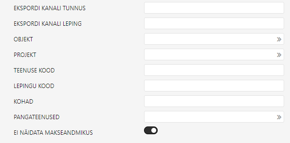 - Maksja registrikood - Makseandmiku esitaja registrikood. Asetub süsteemi seadistuse Firma reg.number väljalt.