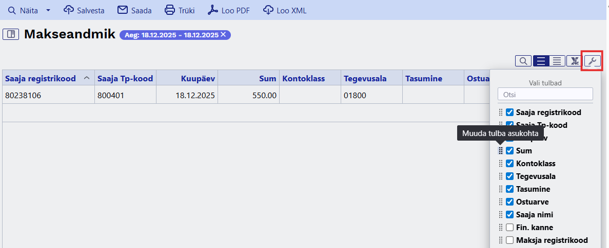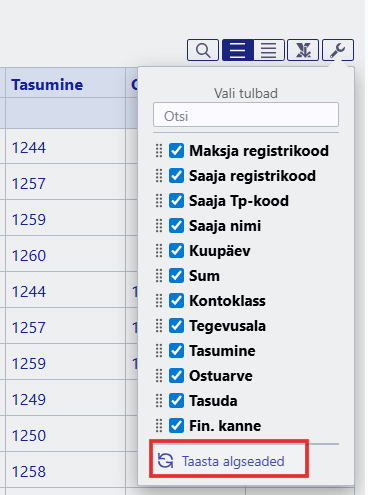 Kui oled muutnud aruande tulpade järjestust või tulpe peitnud, siis enne XML-faili loomist taasta algseaded. Ainult nii on XML-is kõik kohustuslikud ja korrektsed andmed kajastatud.