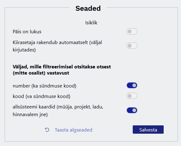 - Lehitsejas paikneva haamrikese seadistuse alt on võimalik määrata, et otsitakse otsest vastavust teatud väljade puhul. Sellisel juhul tuleb sisalduvuse otsimiseks otsisõna järel kasutada %-märki.