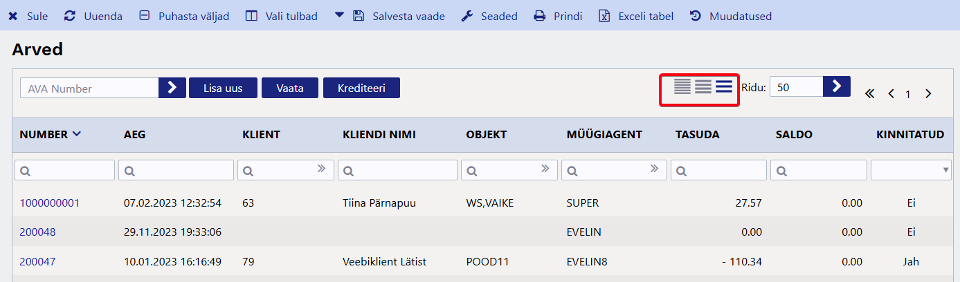 - Salvesta vaade - salvestab kõik otsingu filtrid ja akna asukoha, sorteerimise ja otsingu fookuse