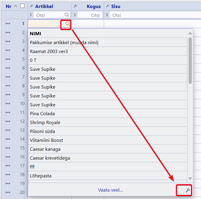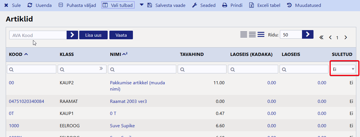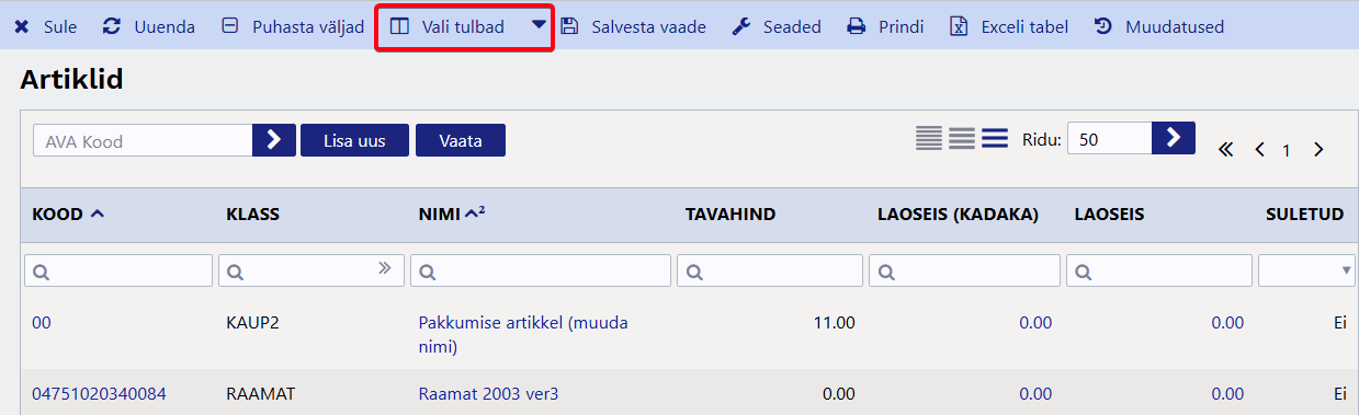 Ülaltoodud ekraanipildil on nähtavaks valitus artikli kood, nimi ja lisaväli Värv, aga otsing rakendub ainult tulpadele Nimi ja Värv.