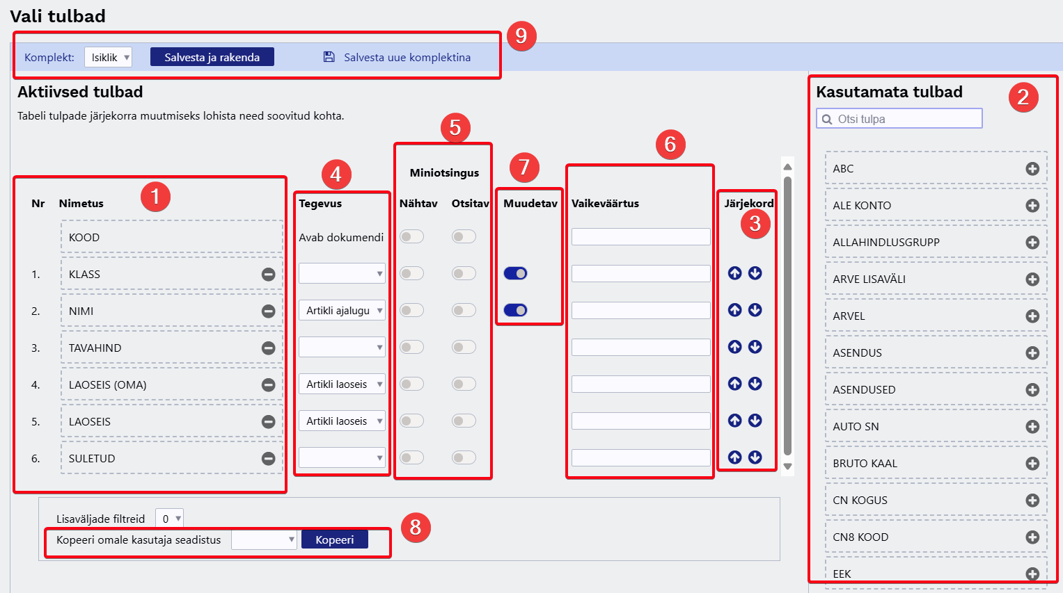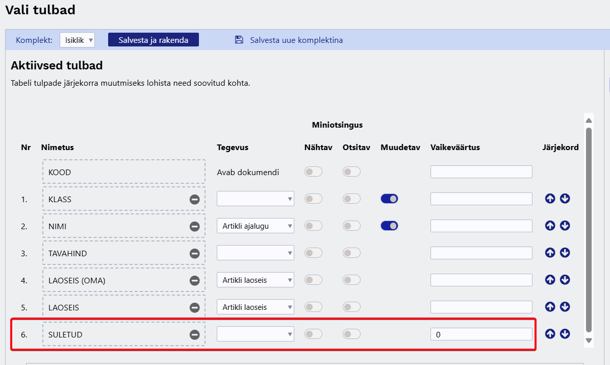 Iga aktiivse tulba juures on võimalik määrata, kas: