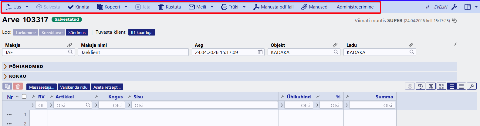 - Administreerimine (müügiarvel) - selle nupu abil saab arvele kaardimakse külge panna ilma terminalita (näiteks kui ühendus terminaliga katkes vmt). Lisaks läheb Koht väli muudetavaks ehk saab ka kohta muuta.