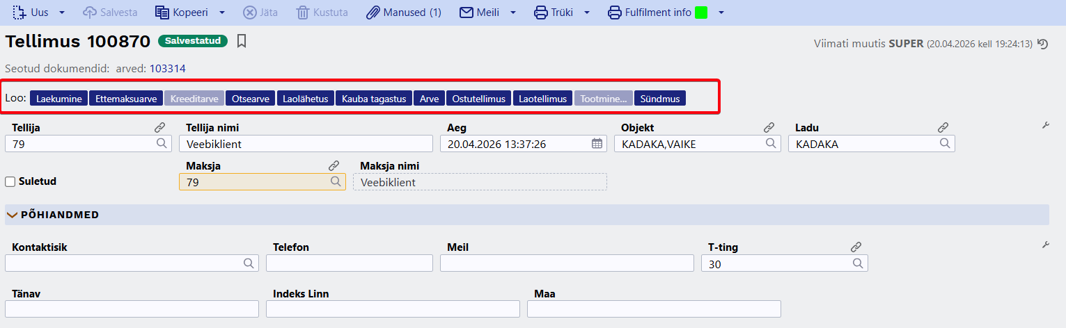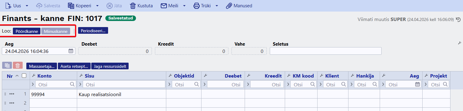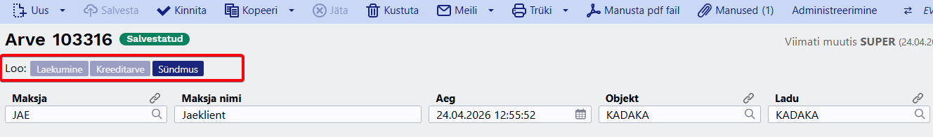 - Kinnita - kinnitab dokumendi ja paljud väljad pole enam muudetavad. Kinnitamise tulemusena tekib automaatselt dokumendiga seotud finantskanne (juhul kui dokument on kannet tekitav).