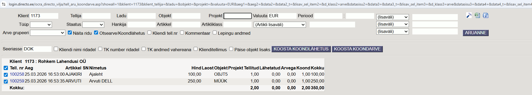 - Objekt - aruanne kuvab vaid neid tellimusi, millel on tellimuse päises või real valitud objekt. Päise ja rea objekt liidetakse filtreerimise jaoks („näita ridu“ valiku kasutades). Siia märgitud objekt lisatakse ka loodava koondarve päisesse.