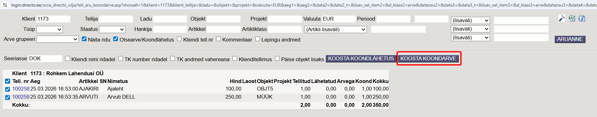 - Hea oleks koonddokumendi tegemisel meeles pidada ja veenduda enne „KOOSTA KOONDARVE“ või „KOOSTA KOONDLÄHETUS“ nupu vajutamist, et nimekiri oleks vajaliku tasemeni filtreeritud ja linnuke märgitud ainult nende ridade/tellimuste ette, mis peavad koonddokumendile minema.