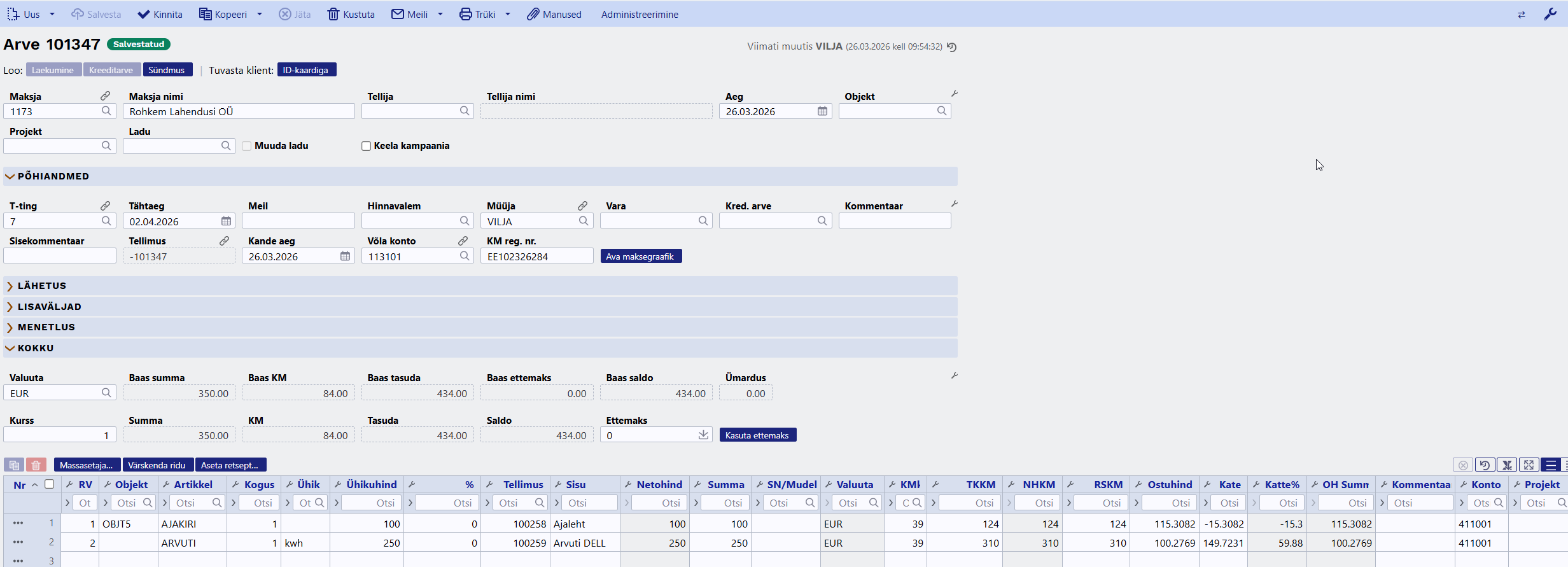 Süsteemi seadistused > Identse reaviitega ridadel peab olema ka sama KM koodon „jah“. - Klienditellimus - valiku tegemisel asetatakse koondarve ridadele (Sisu lahtrisse) kliendi tellimuse number.