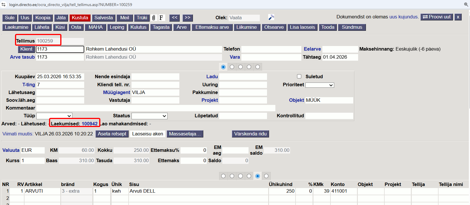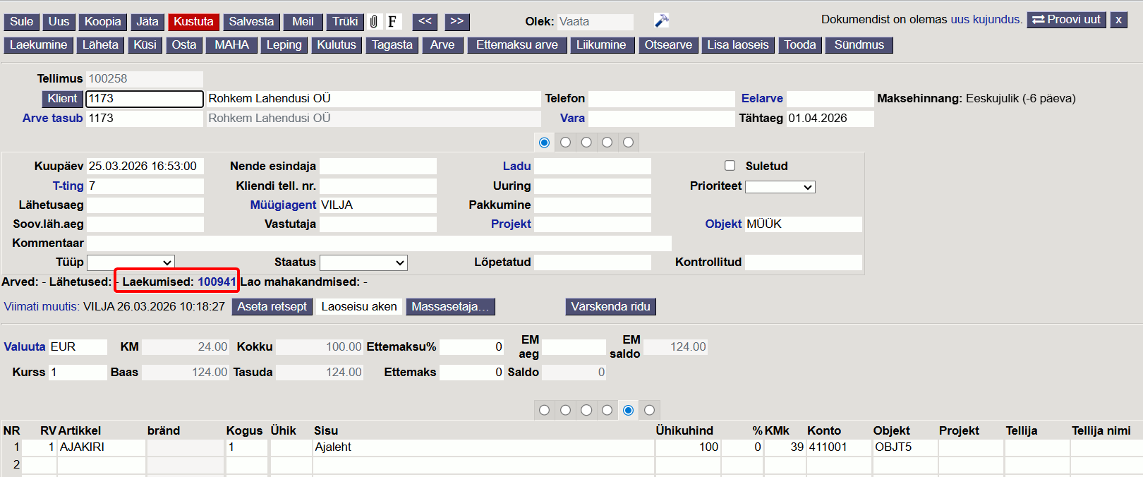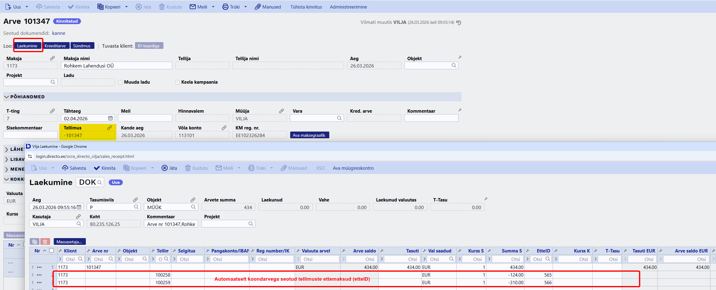 Kinnita arve, tee Laekumine - laekumisele tulevad automaatselt tellimustega seotud laekumised.