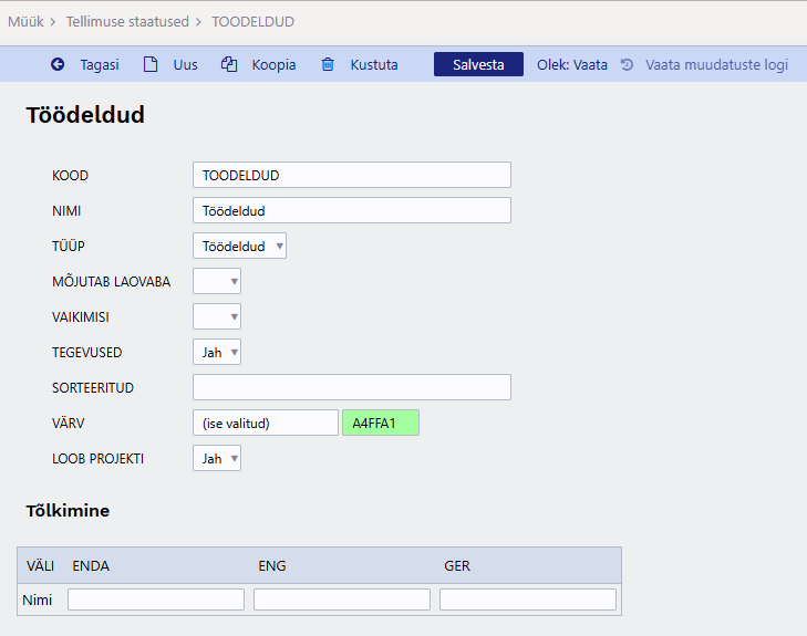 Tõlkimine - võimalik lisada vastavalt valitud keelele staatuse tõlge.