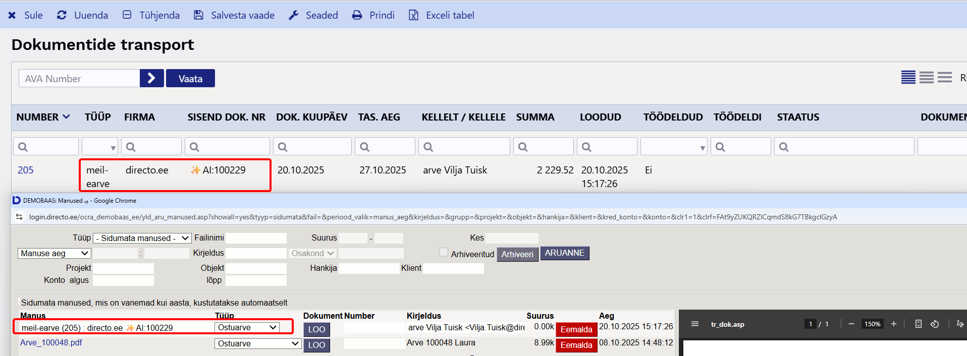 - Kõik uued data.directo.ee postkasti saabuvad PDF-arved töödeldakse automaatselt AI abil e-arveteks.