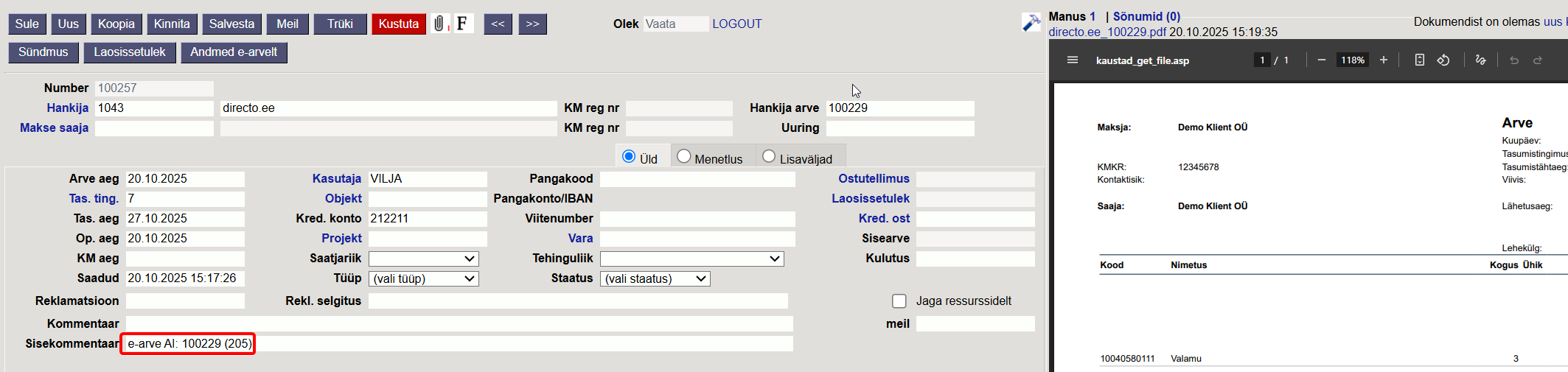 Loodud ostuarvel täidetakse väljad automaatselt e-arve XML faili standardväljade infoga. Ostuarvele on lisatud ka e-arvele lisatud manused.