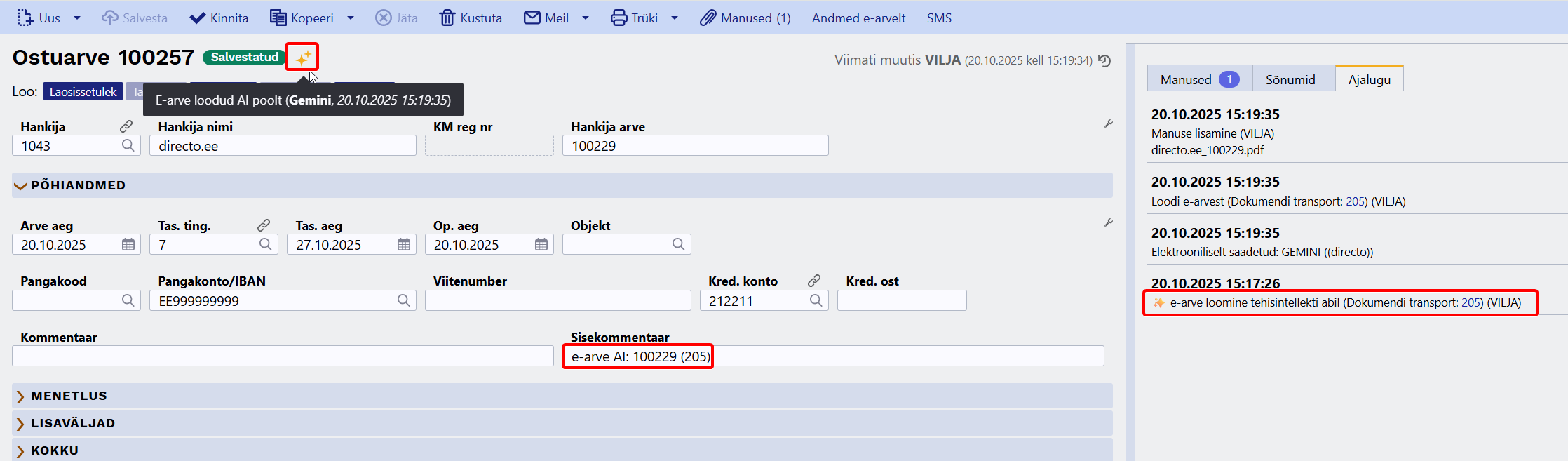 - Kõik Directo AI abil loodud kirjed on tähistatud „Sparkles” ikooniga ✨ — seda näeb nii dokumendi transpordi real kui ka uue kujundusega ostuarve dokumendi ajaloo all kirjes, mis sisaldab aega ja märget e-arve loomine tehisintellekti abil (Dokumendi transport xxx). Vana kujundusega ostuarvel on viide AI'le ainult sisekommentaari väljal.