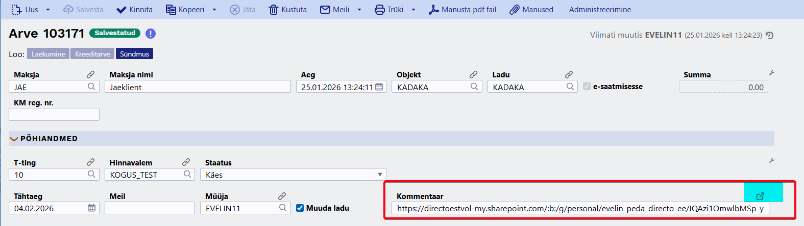 - Dokumendiga tehtavad toimingud - need on seotud dokumendi päises olevate toimingute nuppudega, nt Salvesta, Kinnita, Trüki, Kopeeri.