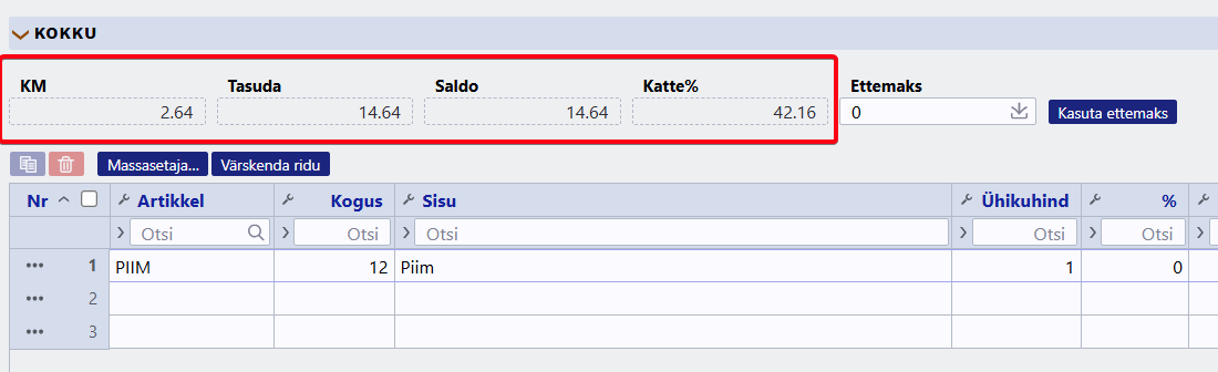 Massasetajaga (nupp tabeli päises) saad lihtsa vaevaga dokumendi ridu täita. Massasetaja aknas on tulpade järjekord sama, mis dokumendil. Kui soovid mõne tulba lisada või kustutada, siis tee see muudatus dokumendil (nupp 'Tabeli häälestus') ja massasetaja aknas järjekord muutub.