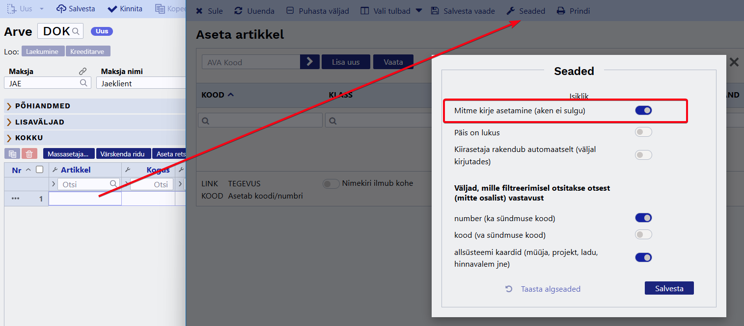 Pakkumiste, arvete ja teiste dokumentide koostamisel võib olla vajalik otsida ja dokumendile asetada mitu sarnast artiklit. Vaikimisi sulgub artikli otsingu- ehk asetamise aken pärast iga kirje valimist, mistõttu tuleb järgmise artikli lisamiseks otsing uuesti avada.