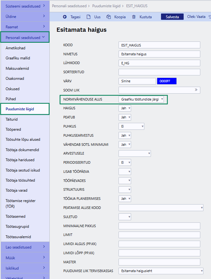 Kui soovid, et töövõimetuslehe puhul vähendatakse normtunde graafiku kirjete järgi (sh nädalavahetuse päevadel), tuleks puudumise liigile normivähenduse aluseks märkida „töögraafiku tundide järgi“.