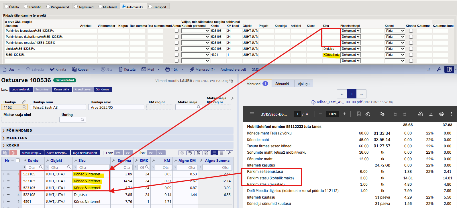 Näide: Telia andmesideteenuste arvel on igas mobiilinumbriga seotud teenusegrupis teenuse rida ‘Parkimistasu’. Juta parkimistasud konteeritakse teistest töötajatest erinevale kontole, erineva käibemaksumääraga ja objektile, mis ei ole Juta töötaja objekt.